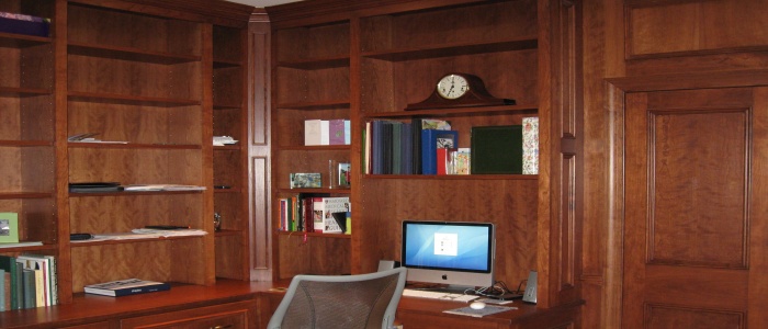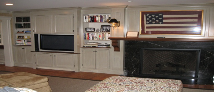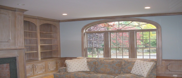 New custom pine cabinets and woodwork stained and glazed. Existing windows faux-finished to match.